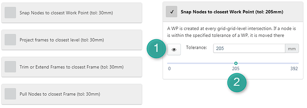After filtering which elements should be repaired you can specify the repair method. Four options are available: Snap to closest work point (grid/grid/level intersection), Project frames to closest level (flatten), Trim or extend frames to closest frame (fillet) and pull nodes to closest frame (snap).