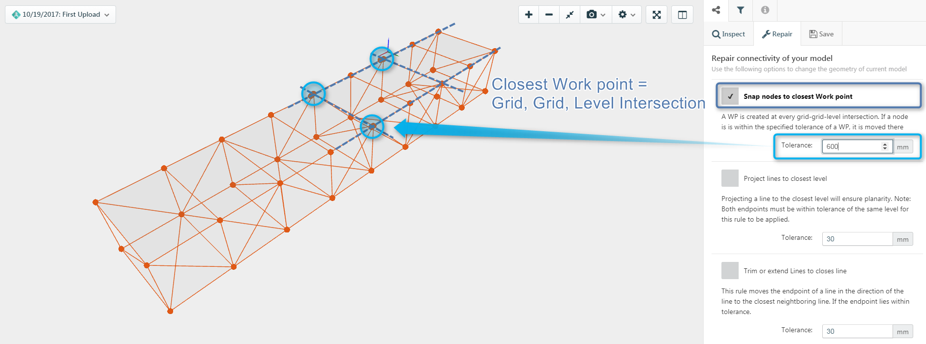 Konstru Connectivity Repair comes with three different repair modes: Snap to Closest Work Point, Project to Closest Level and Trim/Extend to Closest Line. Our example truss contains well defined levels and grids why “Snap to Closest Work Point” is the repair mode of our choice. This mode will pull all nodes within a defined radius to the closest grid to grid to level intersection.