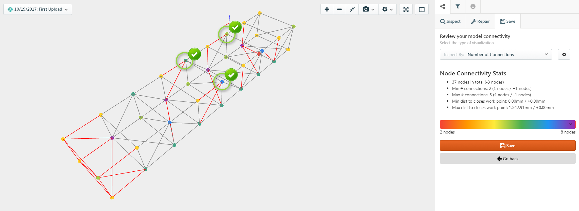 Konstru Connectivity Analysis is the first step to get a well connected model. When activating the Repair tab Konstru automatically checks your model and highlights member nodes by connections. This way you can easily spot failing connections.