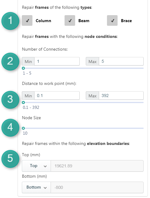 Konstru Connectivity Repair Filters allow you to specify the elements you want to repair. You can filter by type (1), number of connections (2), distance to work point (3: grid/grid/level intersection) and specify the node size to display (4). The last section (5) allows you to filter elements by level, so you can repair elements between two levels only.